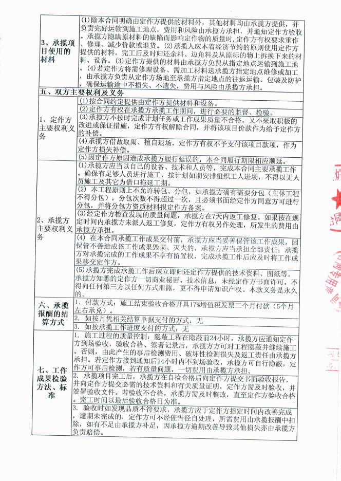 4、乙方不得將工程轉包給其他單位,乙方在接收甲供設備及鋼材需與甲方辦理相關手續,乙方在施工完畢后將所有余材全部移交甲方,并辦好交接手續,一律不得將余材出售或移做它用;